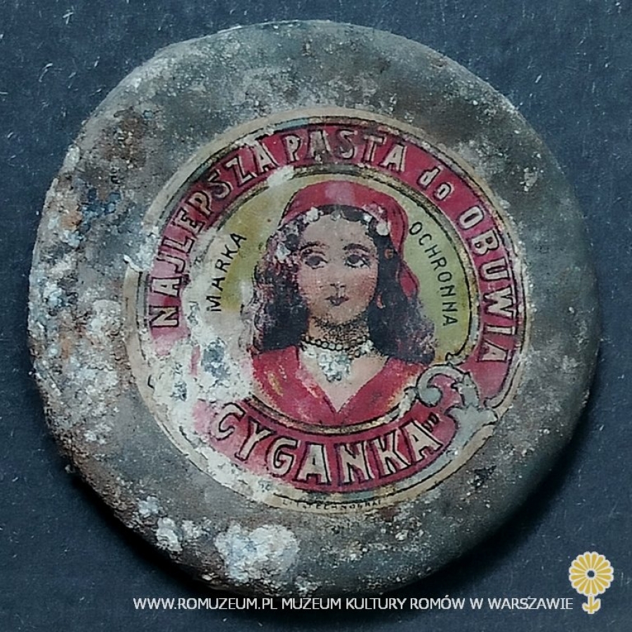 "Najlepsza pasta do obuwia Cyganka", prawdopodobnie warszawska wytwórnia, wieczko aluminiowej puszki (brak denka) ze śladami utlenienia, papierowa etykieta ze śladami uszkodzeń, 0,8 (wysokość krawędzi) x D=6,5 cm, circa 1920