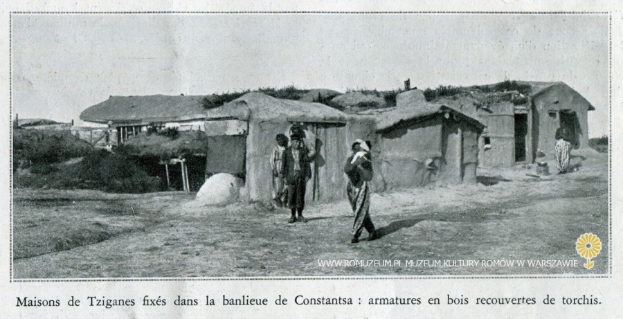 Les derniers nomades européens, Maisons de Tziganes fixés dans la banlieue de Constanza : armatures en bois recouvertes de torchis [Ostatni nomadzi Europy, domy osiadłych Romów na przedmieściach Konstancy: drewniane konstrukcje pokryte gliną], fot. prof. Eugène Pittard w: L’illustration (dwie karty wyjęte z periodyku), Nr 4695, 25 II 1933