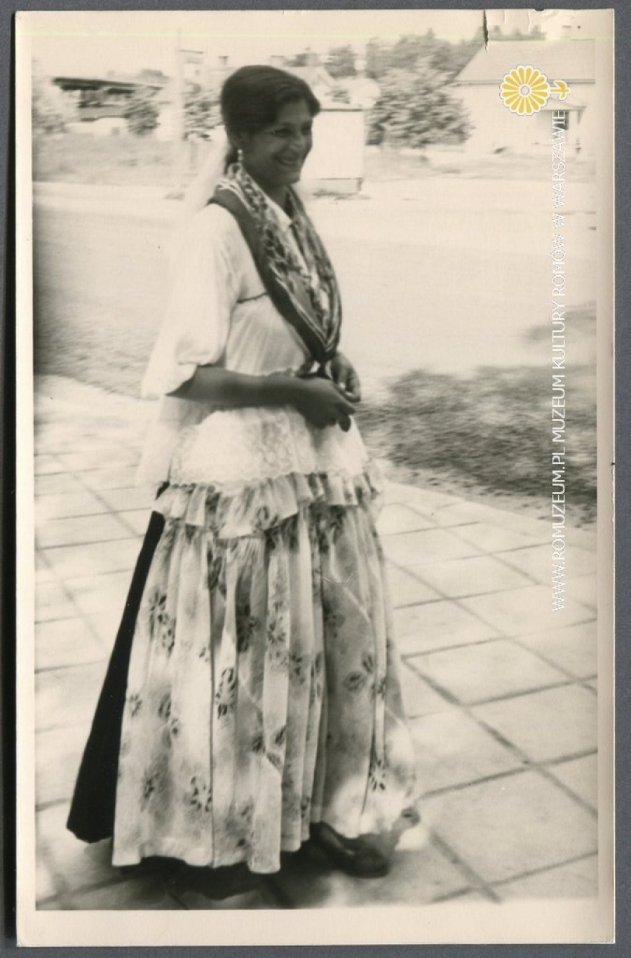 Finnische Zigeunerin Mode Tracht Frau [kobieta w tradycyjnym romskim stroju], autor zdjęcia nieznany, fotografia na papierze (rewers z podziałem pocztówkowym), 15,5x10 cm., Helsinki (Finlandia) 1962