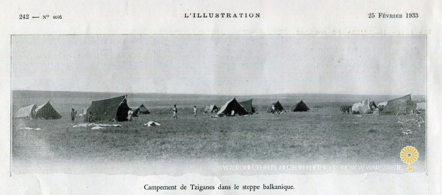 Les derniers nomades européens, Campement de Tziganes dans le steppe balkanique [Ostatni nomadzi Europy, obóz na bałkańskim stepie], fot. prof. Eugène Pittard w: L’illustration (dwie karty wyjęte z periodyku), Nr 4695, 25 II 1933