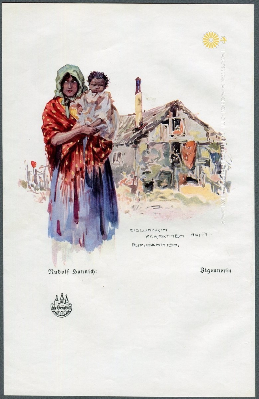 Zigeunerin (Karpathen), Rudolf Hannich (*1880 Reichenberg/Liberec, Czechy - †1962 prawdopodobnie Wiedeń), w: "Die Bergstadt", Ilustrowany miesięcznik literacko-kulturalny wydawany przez Paul Kellers Monatsblätteredit/Bergstadtverlag Wilh. Gottl. Korn (Wilhelm Gottlieb Korn), 16,0 × 25,1 cm; Leipzig – Breslau – Wien, 1919