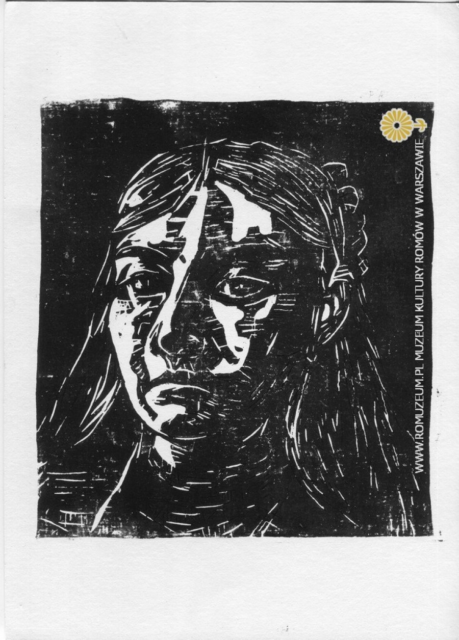 "Cyganka", drzeworyt, wykonał Marcin Czarnowski wg własnego rysunku inspirowanego fotografią nieznanej kobiety romskiej, 29,7 x 21 cm, circa 2020